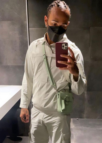 Lewis Hamilton wearing the Reporter Box Bag in color Sage